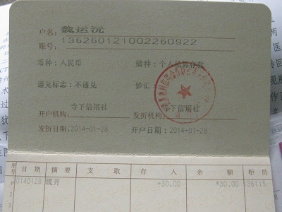 開戶行:上猶縣農村信用合作聯社寺下信用社
